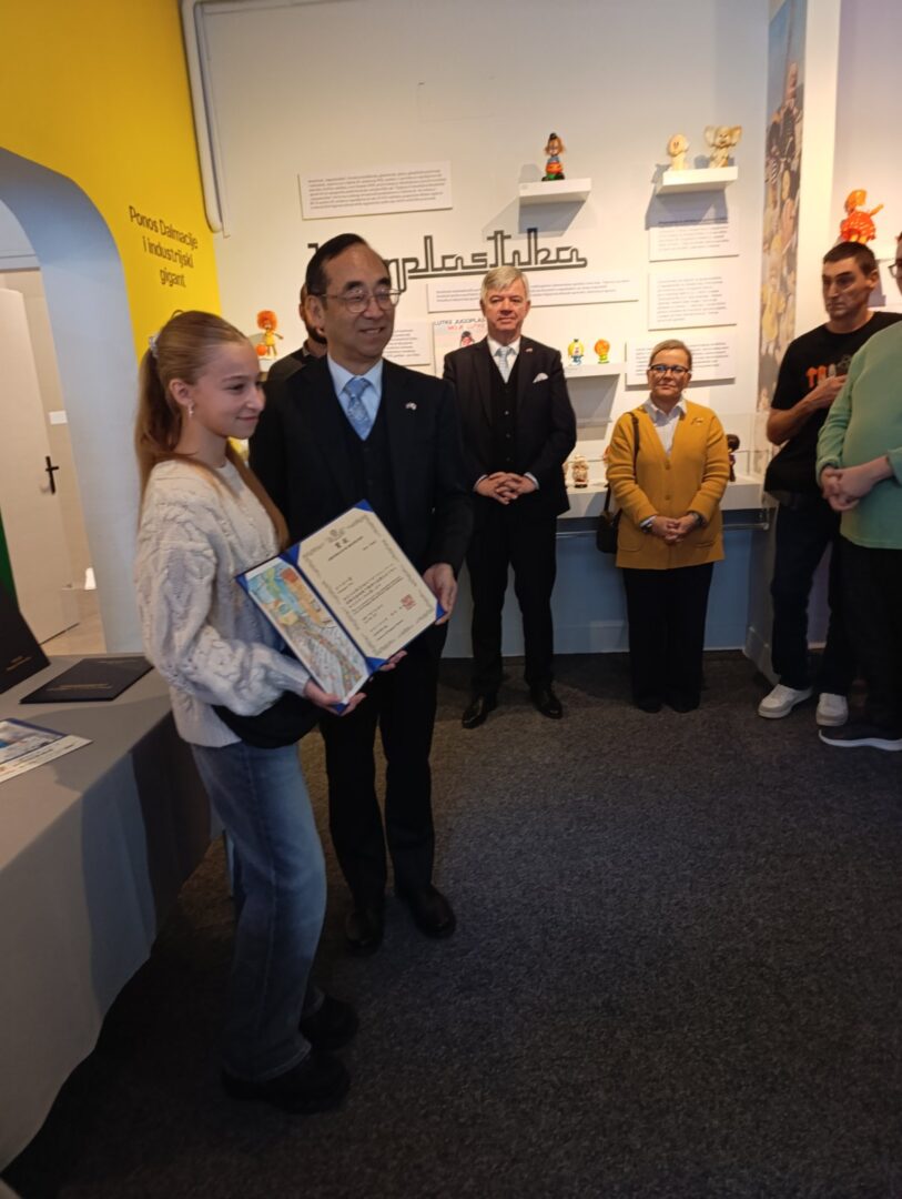 „U Galeriji Hrvatskoga školskog muzeja dočekali su nas veleposlanici iz Japana i Česke koji su nam dodijelili nagrade te sam čak naučila reći arigato ( hrv. hvala).