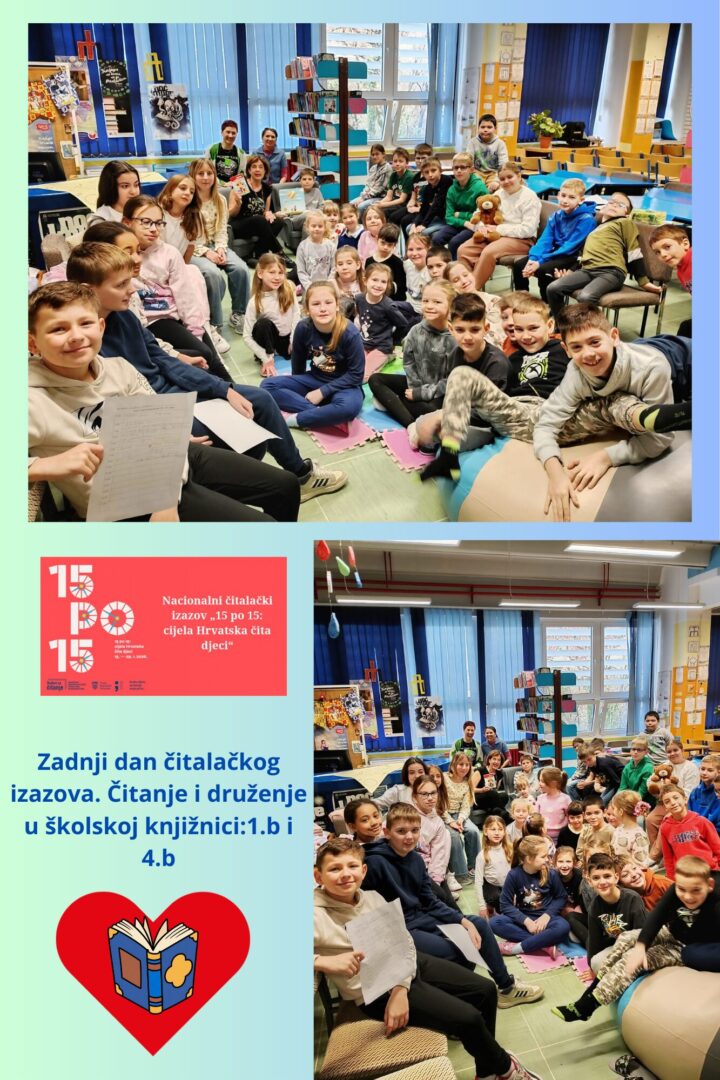 Posljednji dan izazova bio je poseban i svečan. Svi smo se okupili u školskoj knjižnici i kraj izazova obilježili zajedničkim čitanjem. Četvrtaš Mar i knjižničarka su čitali te pokazali kako je lijepo i poticajno kada „veliki“ čitaju „malima“ te čitanje postane aktivnost koja nas spaja i veseli.
