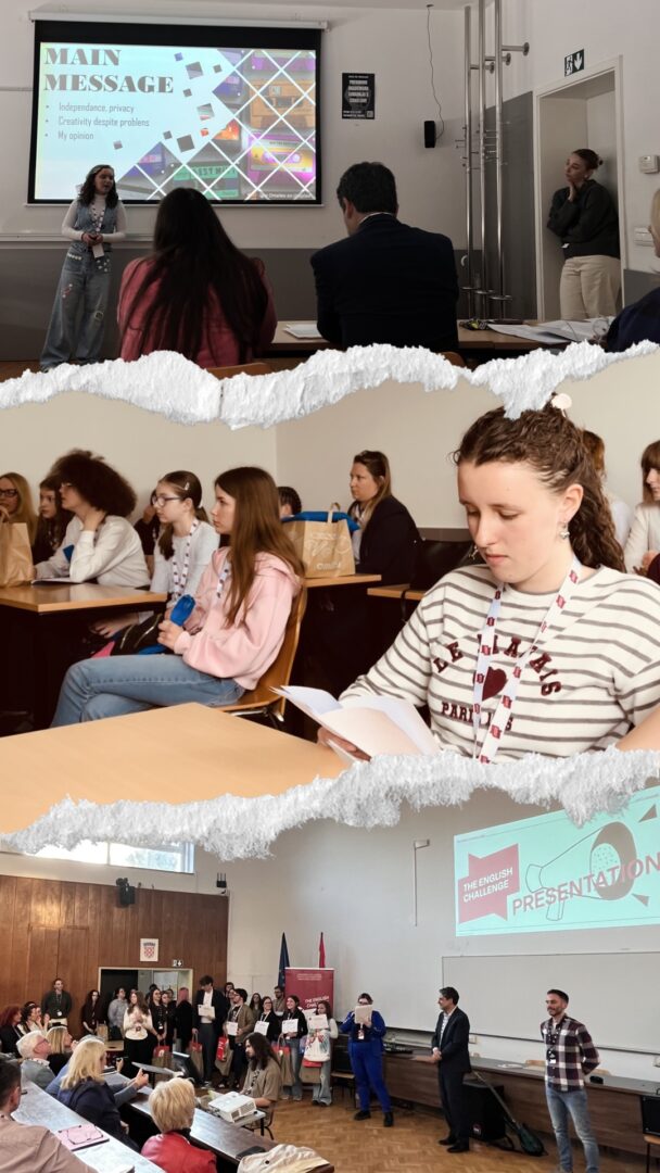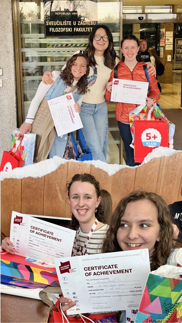 Našu školu predstavljala je Marta Nekić (7.b) u kategoriji pisanja priče (Story Challenge). Pred stručnim pojerenstvom uspješno je predstavila svoju priču Two Childhoods, One Lesson te osvojila izvrsno 2. mjesto i pohvale za kvalitetno pisanje. Karolina Peranić (8.a) natjecala se u kategoriji izlaganja (Presentation Challenge), tj. izrade prezentacije na zadanu temu na licu mjesta i držanja govora pred povjerenstvom. Zahvaljujući izvrsnim govornim i prezentacijskim vještinama te zanimljivom pristupu temi „Free time in the 1980s“ u potpunosti je oduševila žiri i zasluženo osvojila prvo mjesto.