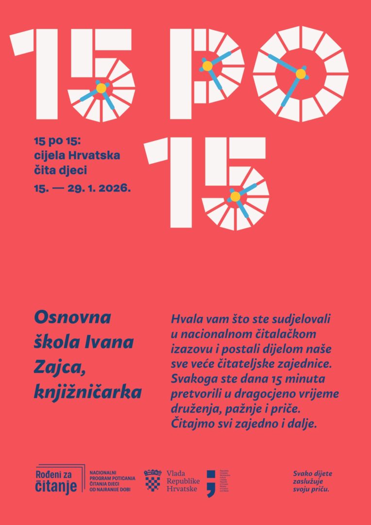 Zahvalnica učenicima 1.b razreda, učiteljici Borki Reljac i školskoj knjižničarki Koraljki Mahulja-Pejčić za sudjelovanje u nacionalnom čitalačkom izazovu.![]()